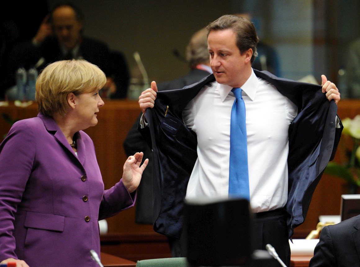 | Angela Merkel e David Cameron numa conferência de imprensa no Reino Unido |